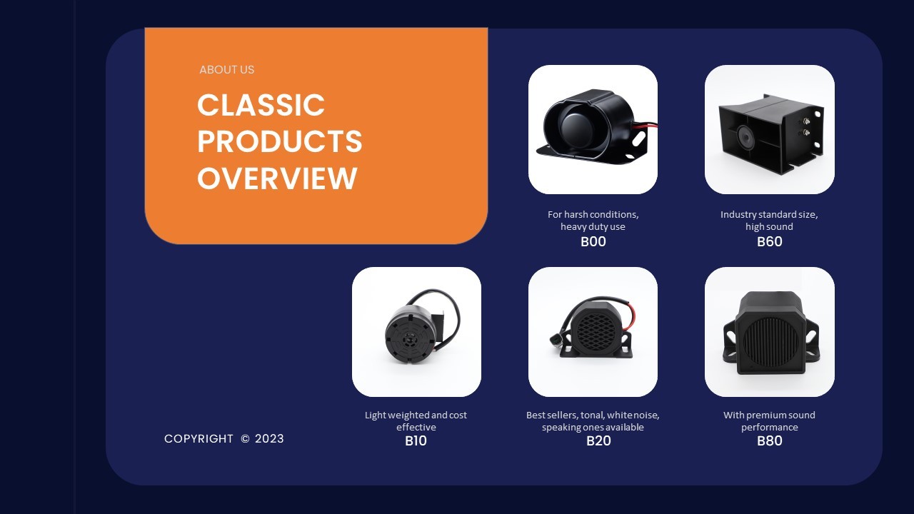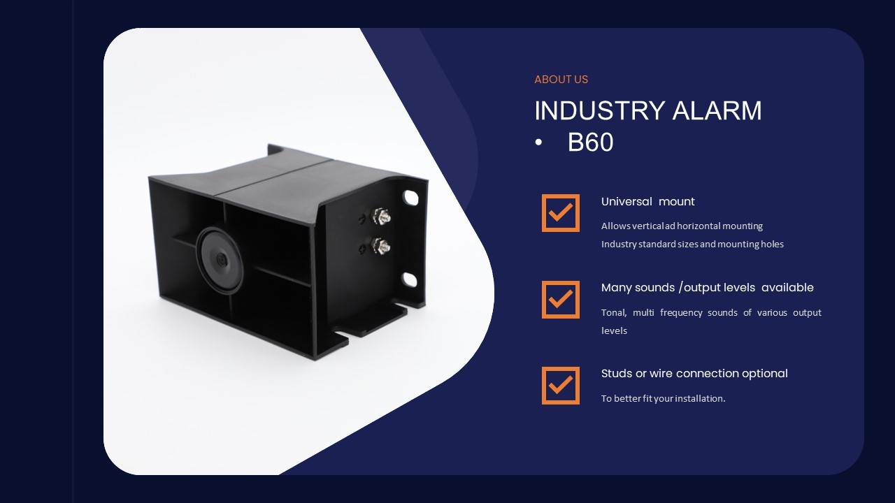 B60报警器系列产品适用于各种大中型车辆/设备,推荐中度及重度噪声区域使用。是工程机械领域使用较多的产品系列。