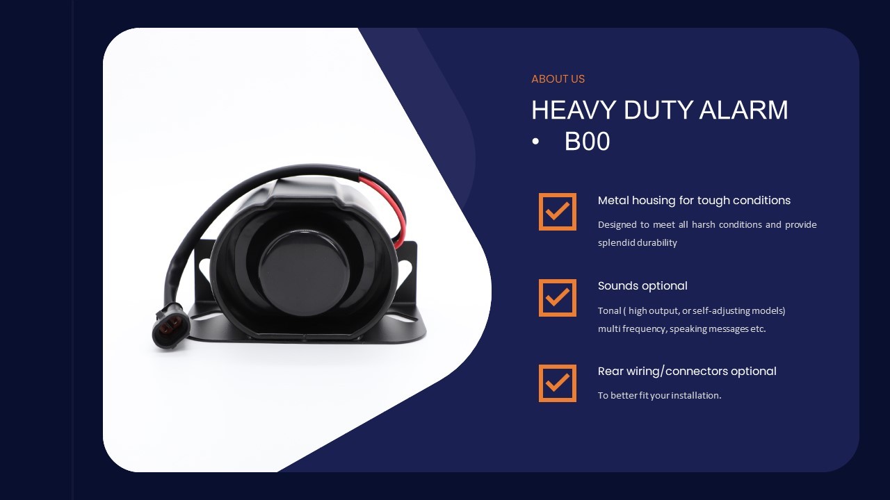 B00报警器系列产品适用于各种大中型车辆/设备,推荐中度及重度噪声区域使用。是工程机械领域使用较多的产品系列。